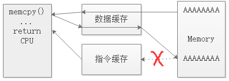 设备的CPU有2个分开的缓存:指令缓存和数据缓存。memcpy()写入的数据经过数据缓存存入内存中,但是指令缓存并未更新,返回的位置的代码未发生变化。